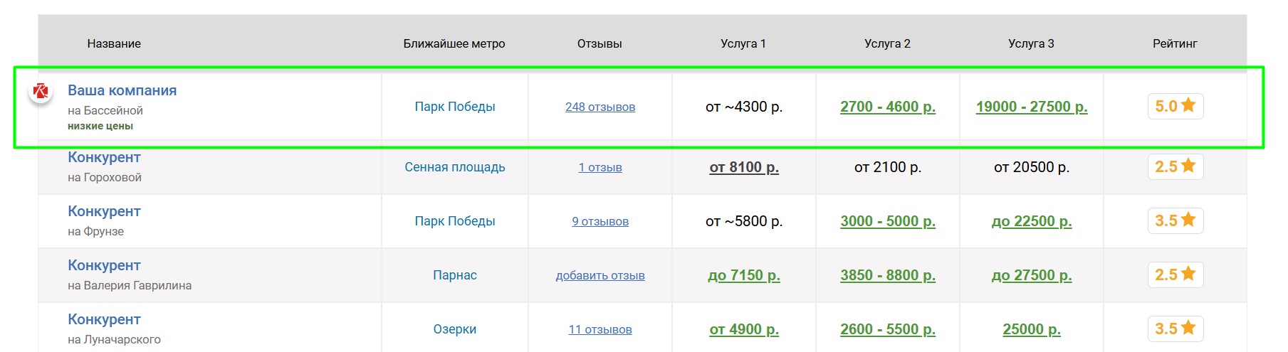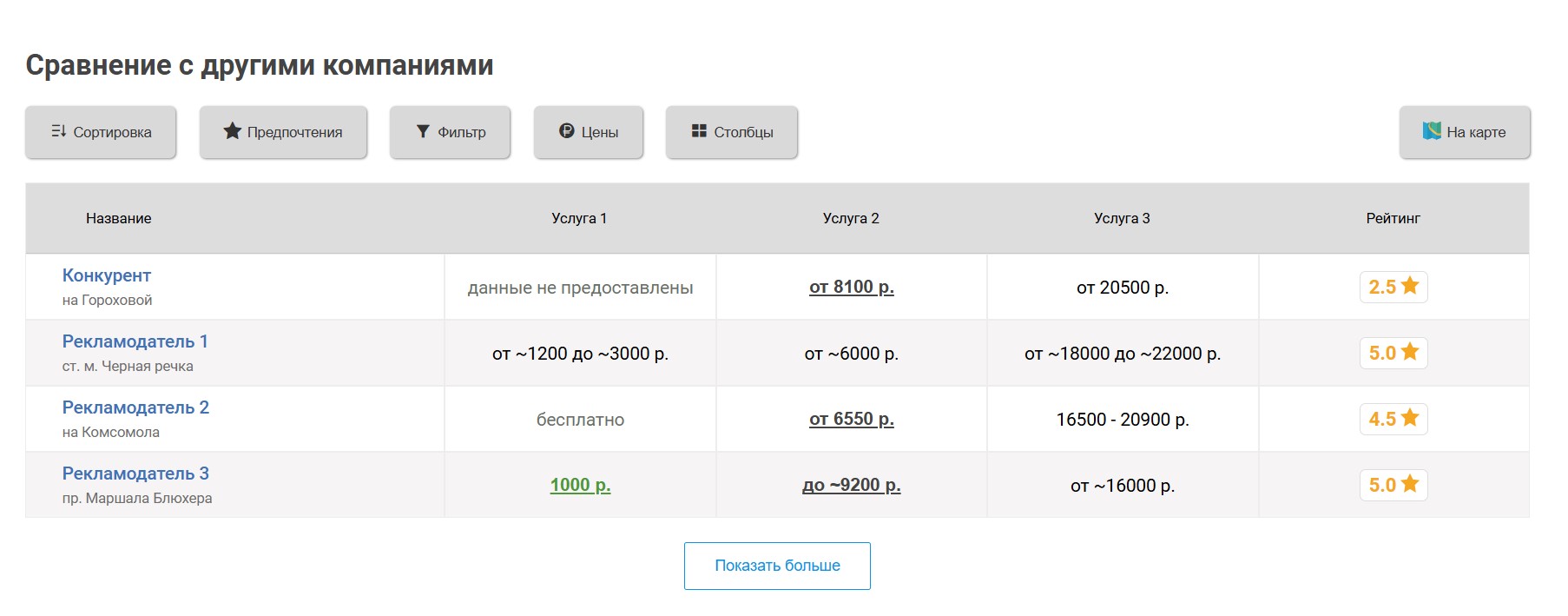 студий, продвигаемая студия попадёт к ним в таблицу «Сравнение по ценам», которая выглядит следующим образом: